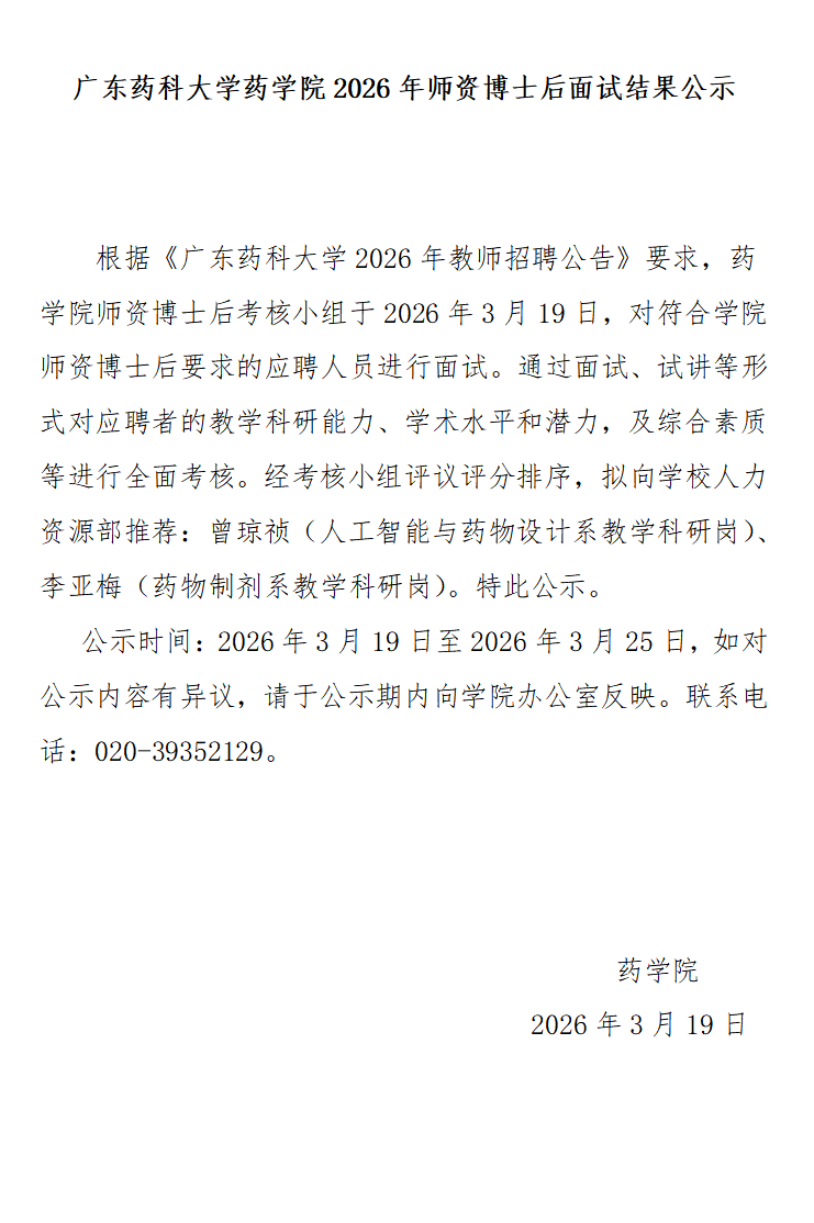 广东药科大学药学院2026年师资博士后面试结果公示