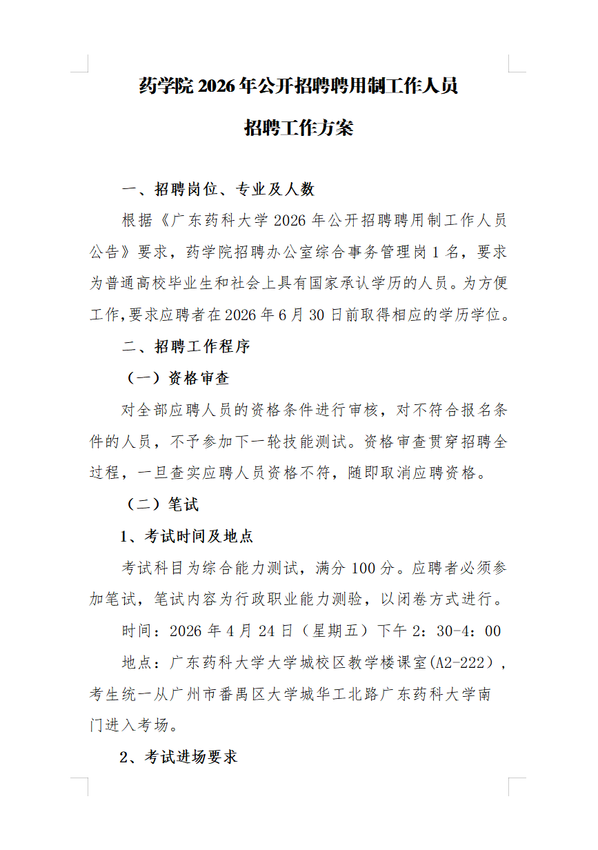药学院2026年公开招聘聘用制工作人员招聘工作方案